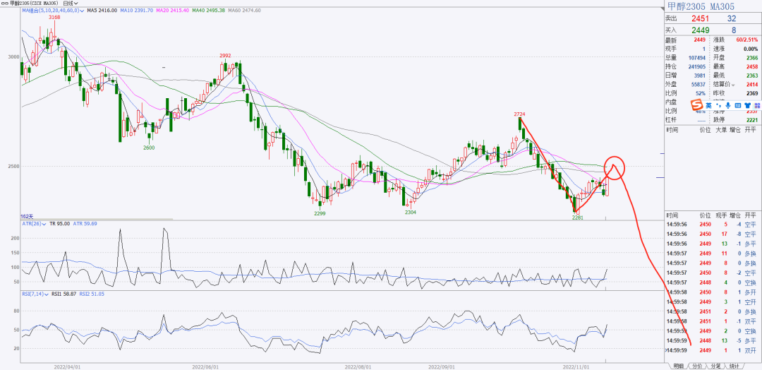 1、化工板块没有特别想做的,大多都是震荡的图形或者我看不懂的图形。关注一下甲醇05吧,有点像123浪的酝酿形态,关注能否反弹到60均线附近出现做空机会。