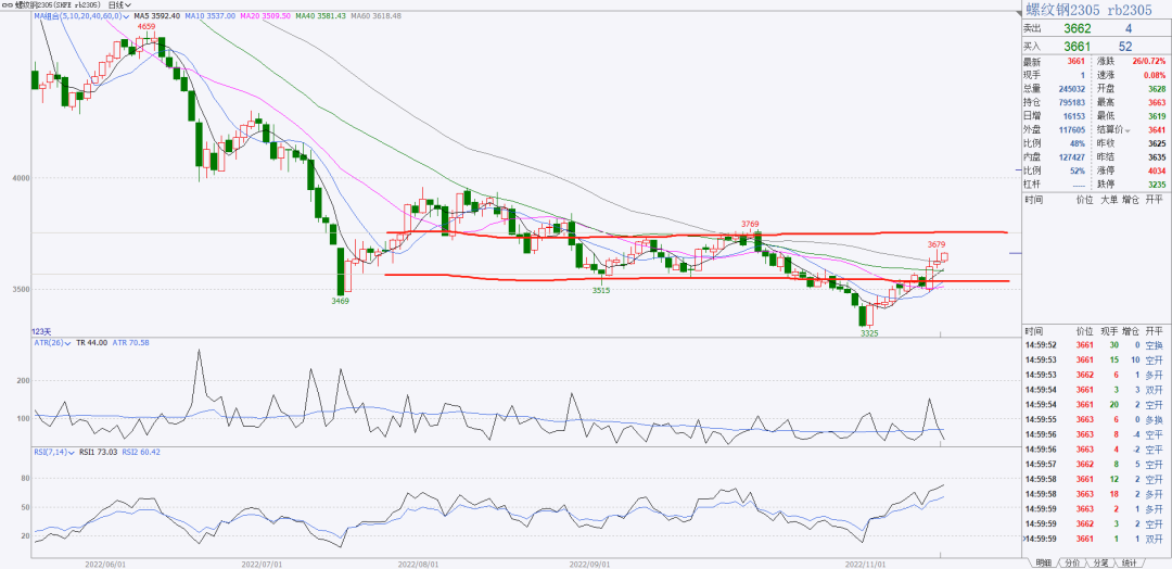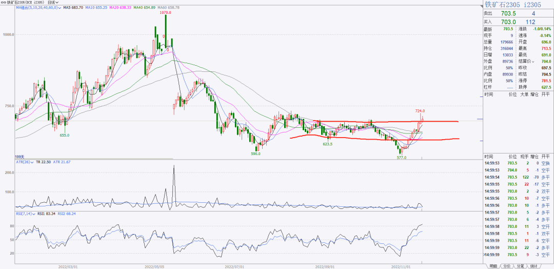 3、铁矿05的形态最强,已经突破了10.10日的高点,要进入上涨趋势了,可以关注做多机会了。