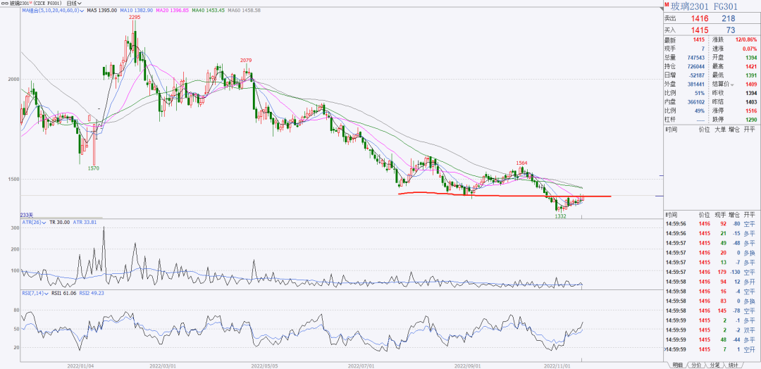 4、玻璃的1400这个位置,好像要压不住反弹了,要是被突破了就不能看空了。