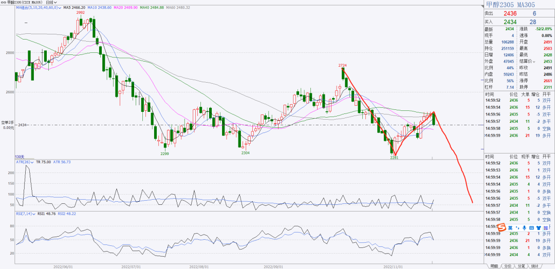 1、甲醇05反弹到60均线附近出现反包标K,我轻仓做空了,继续持有。