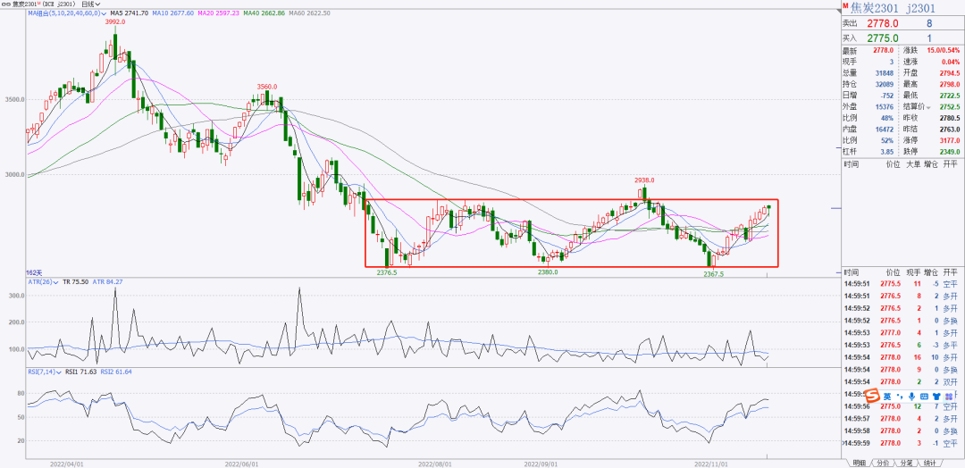 2、焦炭焦煤我现在只看得出是宽幅震荡,其他的看不出来,观望。