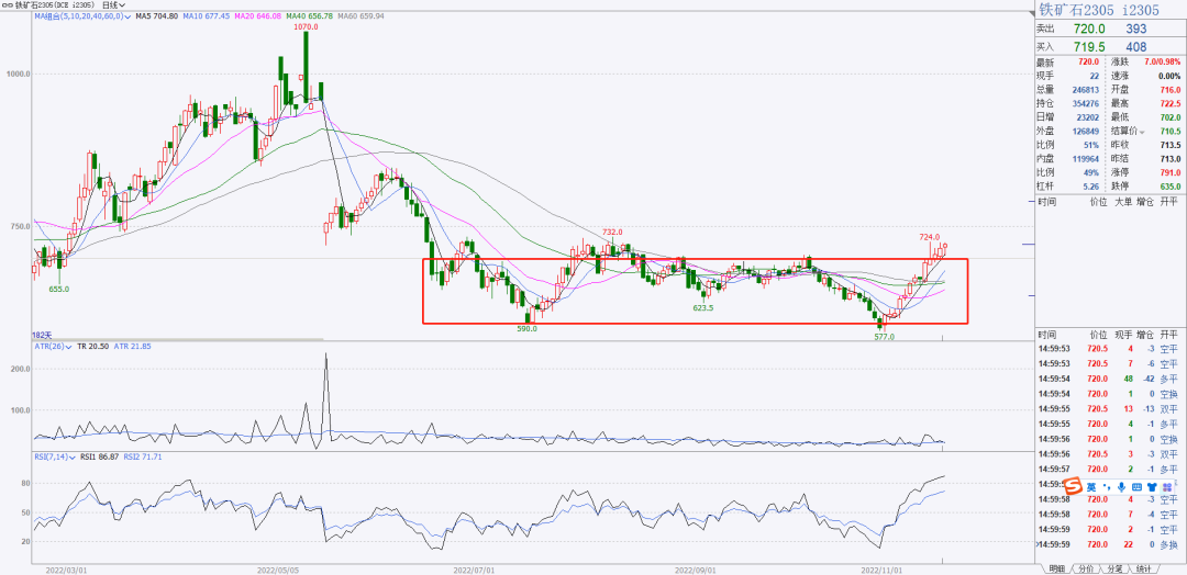 3、铁矿盘中跌那么多,下午多头竟然收复失地,收了长下影,而且这个位置是向上突破了最近四个月的高点,可以算是标k突破。下午做甲醇和沪铝没顾上这个,晚上找机会尝试参与一下。