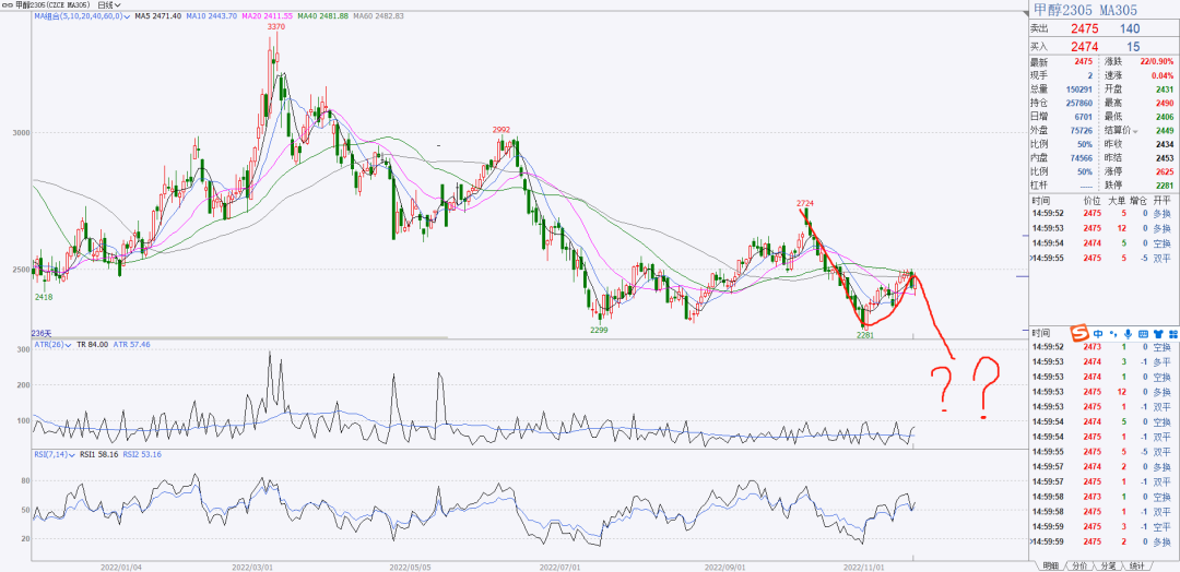 1、甲醇05我昨天空了,但是今天的阳线太强了,而且甲醇今天成交放量。这个123浪估计走不成了,我要计划出了。