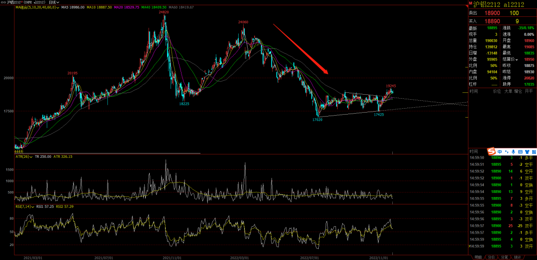有色。昨晚我把沪铝的多单出了,集合竞价的时候成交的。沪铝虽然突破了三角形区间,但是前面的定式是下跌的。所以不能轻易做突破。要耐心等标K 。