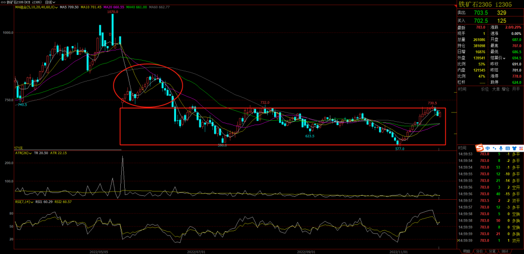黑色。今天主要还是看铁矿,铁矿虽然均线多头排列,但是上方压力很大,这种时候不应该轻易做突破的。我上周的分析错了,铁矿现在如果要参与我只会选择影线标k参与。