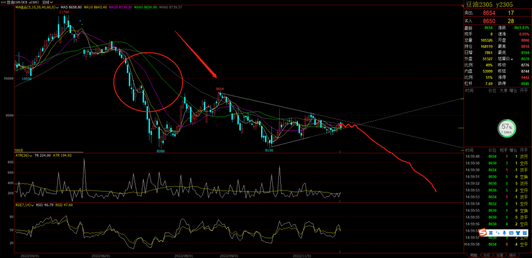农产品:油脂现在比较分化了,豆油在一个三角形里,结合前面的定式看下跌的概率大。等豆油05跌破8400之后再考虑做空。