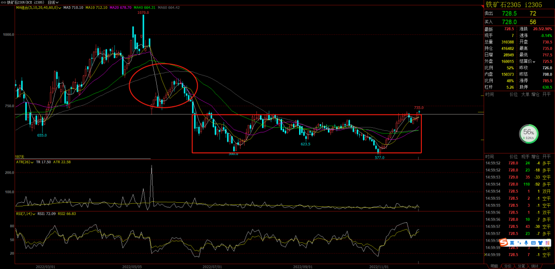 黑色:螺纹的主力已经换到了01 。我觉的黑色里面形态最强的还是铁矿,铁矿的均线已经多头排列,形态已经向上突破近期高点,现在向上面临6月份的高点压力,所以虽然看多但是不能轻易追高。我等铁矿05向上突破740之后再考虑做多。晚进场几天可以确定性更大一些,现在进不好判断方向。