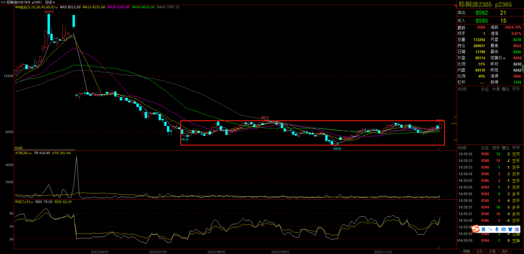 农产品:油脂今天简直太强了,不能看空了,重新看多油脂。棕榈是最强的,棕榈05向上突破8870之后可以等影线标k做多。
