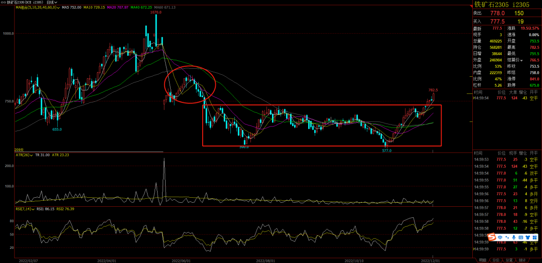 黑色:螺纹05今天增仓18万手,即将向上挑战3900的压力位。铁矿的主力今天转移到了05合约,上方是6月份的高点压力,均线已经多头排列了,这种形态只做影线标k,最好只做一个方向,摸顶有点危险的。