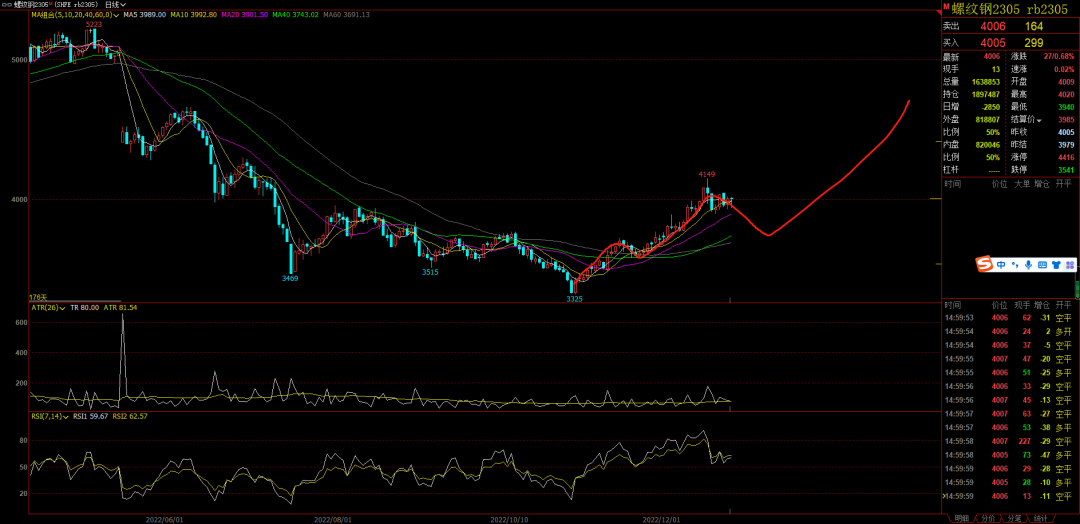 黑色:螺纹铁矿盘中太犀利了,上周五晚上临收盘之前忽然跳水,今天下午多头又拉起来。但是持仓量并没有明显的增加。虽然螺纹又重新收盘在了4000之上,但是我不会追多了。这个形态是一浪的末尾,我还是坚持等二浪调整。