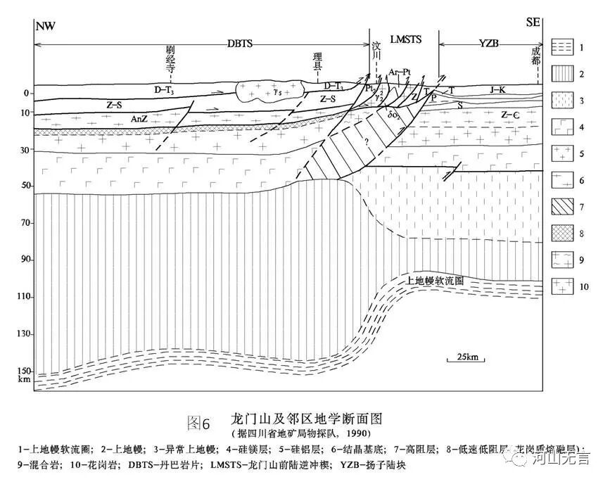 这是四川省地矿局物探队根据地球物理勘探数据绘制的横穿龙门山的地壳-岩石圈结构的断面图,可以看到龙门山地块(图中的LMSTS-龙门山前陆逆冲楔)上部有断层面向西北(即图左侧)倾斜的一系列断裂,它把龙门山切割成叠瓦状的一组断块。这些断裂向下在10公里左右的深度都交汇到一条十分平缓的断裂面上,汶川地震以及之前一系列小震的震源也集中于这个深度附近。