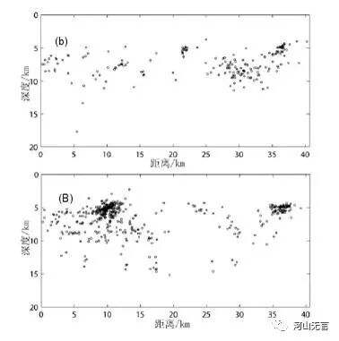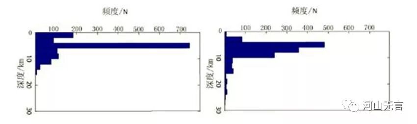(a)精定位前地震频度-深度 (b)精定位后地震频度-深度