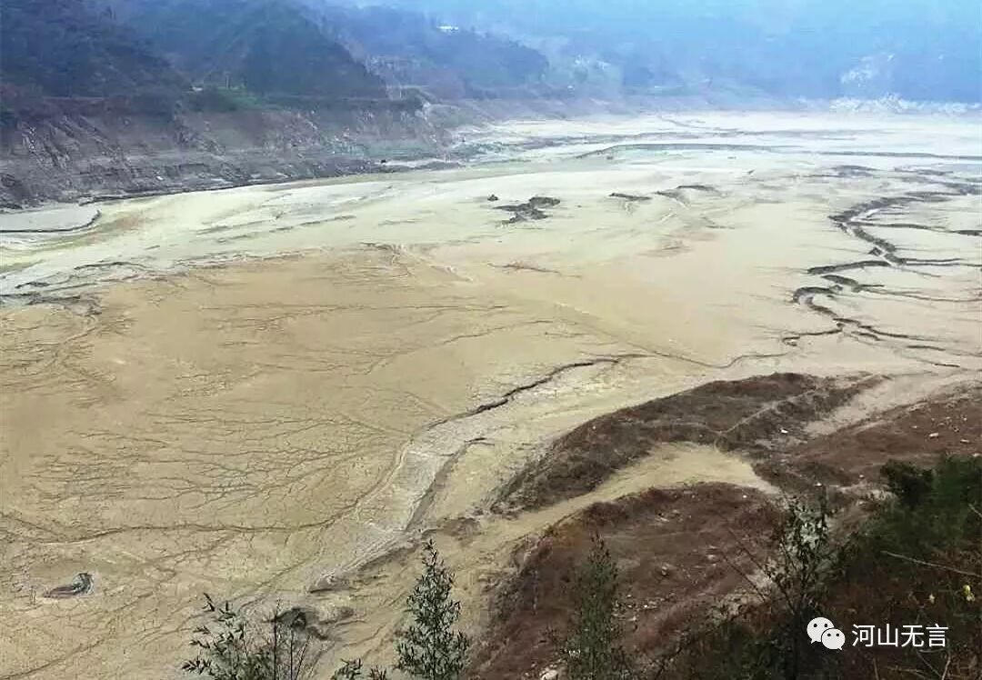 2018年2月21日,紫坪铺水库的泥沙淤积。王一忠摄影(注:王一忠是居住在紫坪铺水库边的汶川水田坪村村民。)