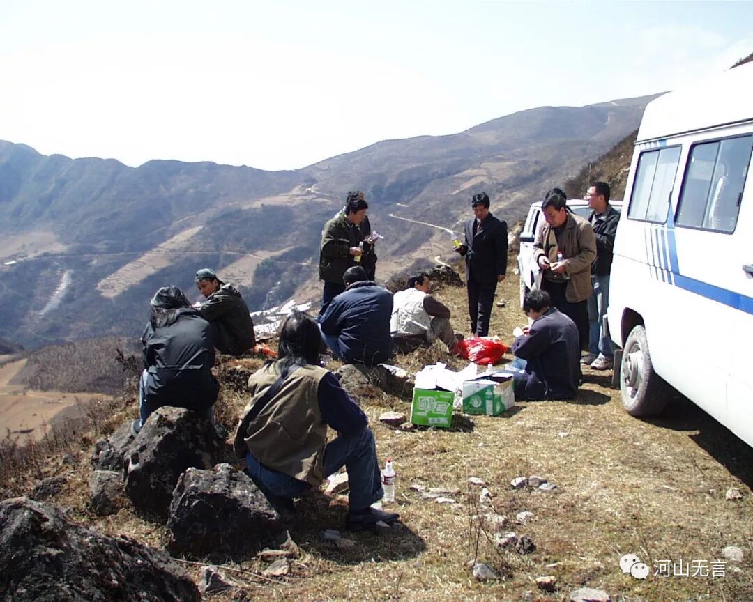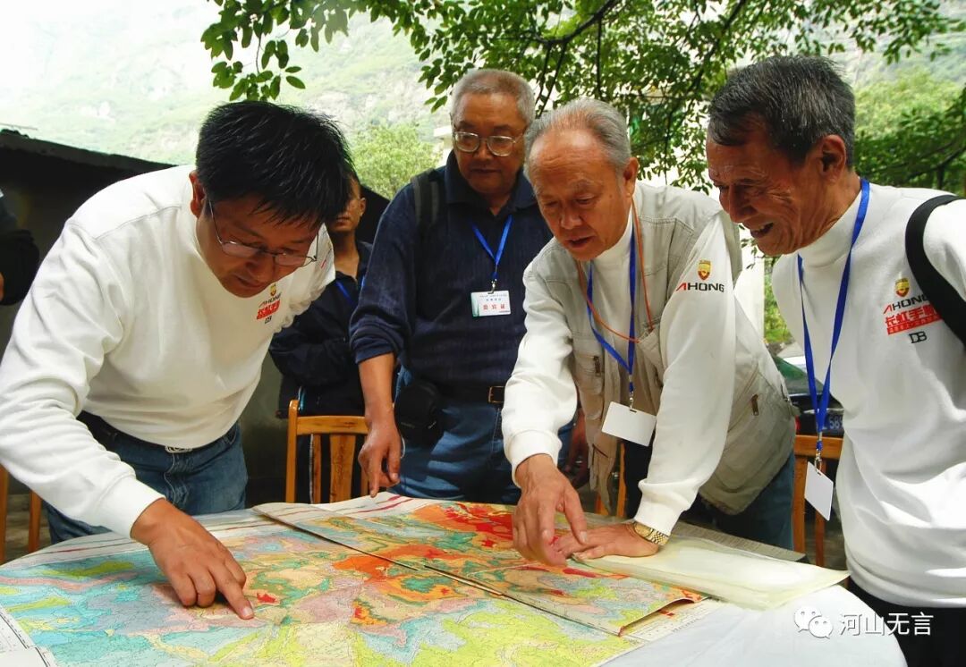 2006年10月,大渡河金口大峡谷科考途中,笔者在给中国科学院的专家杨逸畴(左二)、李明森(左三)、李成治(左四)等介绍大峡谷的地质情况。