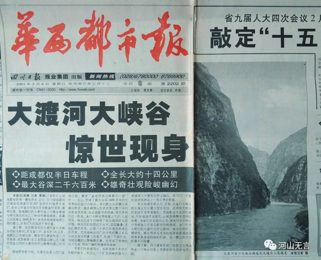 2001年2月4日,发表在《华西都市报》头版头条的文章《大渡河大峡谷惊世现身》,这是第一次把大渡河金口峡作为自然景观地向社会及公众进行的报道。