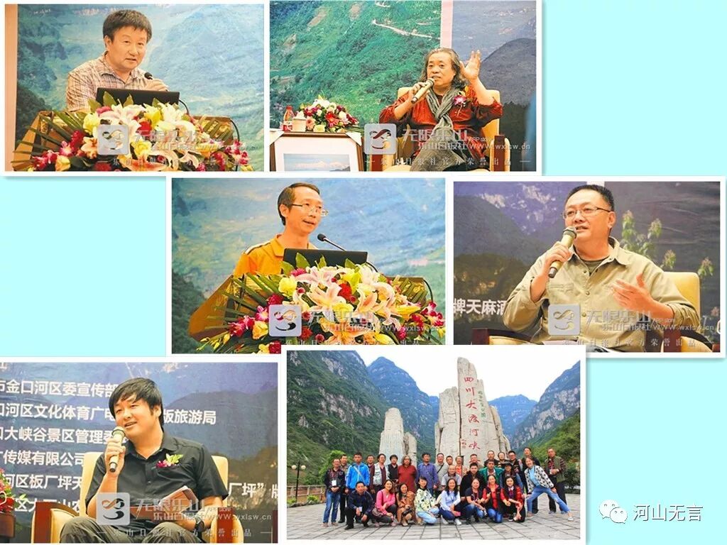 2016年,大渡河金口峡发现15周年、大渡河峡谷国家地质公园建立15周年之际,乐山市暨金口河区政府举行了“相约大瓦山,探秘金口河”山地文旅论坛与科考活动。图为亲历大渡河金口峡的发现、以及参与国家地质公园建设与宣传推广的人士,在论坛上发言。由上至下、由左至右依次为:地质学者范晓、摄影家林强、原金口河区委宣传部部长张黄荣、原成都电视台编导章晓、原中国国家地理杂志编辑易水。
