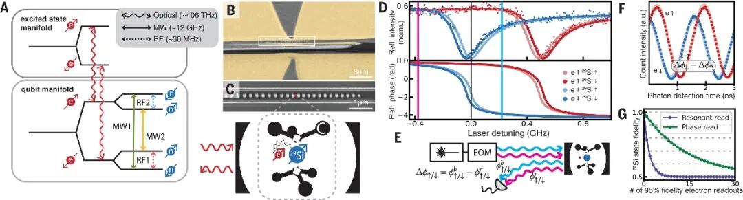 电子状态的高保真谐振读出是通过测量激光在最大反射强度对比的频率下的反射强度来实现的(图1D)。使用电光调制器(EOM)产生边带(图1E),作者沿同一路径发送两个音调(图1D),并通过产生的跳动模式测量自旋依赖的反射相位差,以确定电子状态(图1F)。有了这种基于相位的读出方法,在造成1/e的核相干性损失之前,电子可以以95%的保真度被读取14次。这比谐振式读出方法(图1G)提高了8倍。