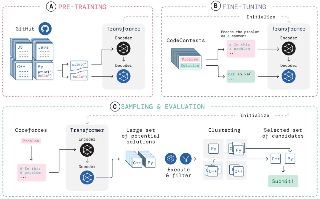 编程是一个强大的、无处不在的解决问题的工具。能够协助程序员甚至自己生成程序的系统可以使编程更有成效,更容易获得。最近的基于变压器的神经网络模型显示了令人印象深刻的代码生成能力,但在需要解决问题技能的更复杂的任务上,如竞争性编程问题,仍然表现不佳。