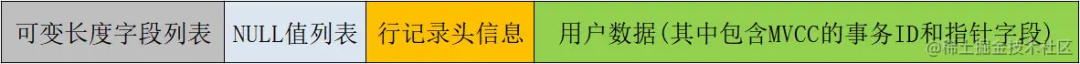 | 可变长度字段列表 | 不固定 | 来保存那些可变长度的字段占用的字节数,比如varchar、text、blob等。若变长字段的长度小于 255字节,就用1字节表示;若大于 255字节,用2字节表示。表字段中有几个可变长字段该列表中就有几个值,如果没有就不存。 |