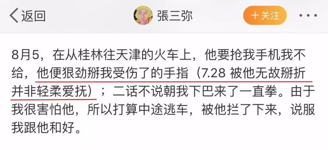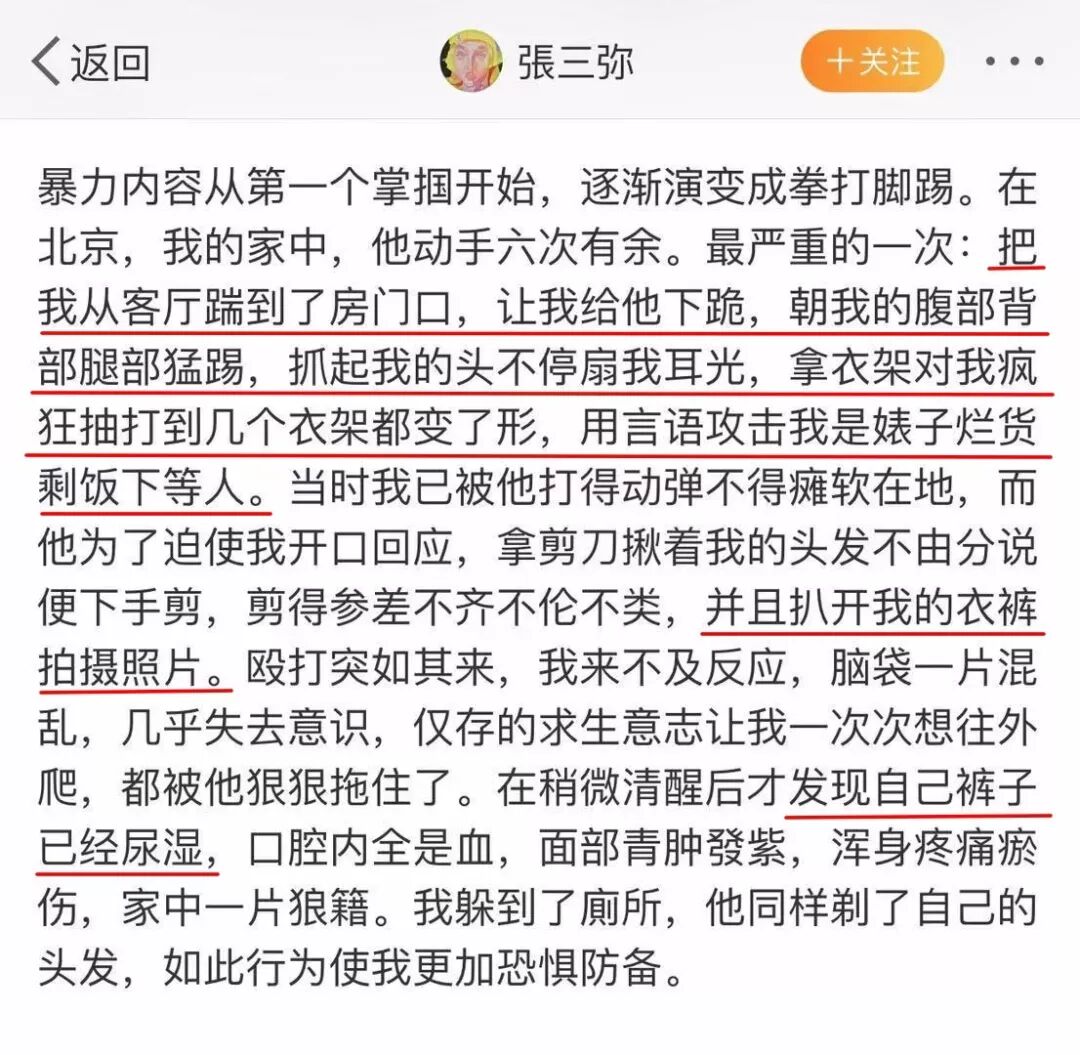 张三弥在微博长文中不止一次的提到,张嫮目让她下跪的事,踹到门口让她跪着接受耳光,跪在床上数自己挨了几个耳光……