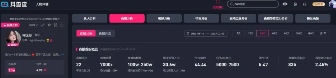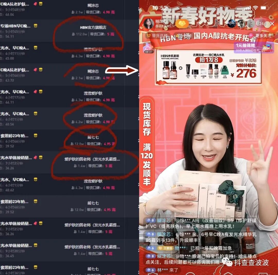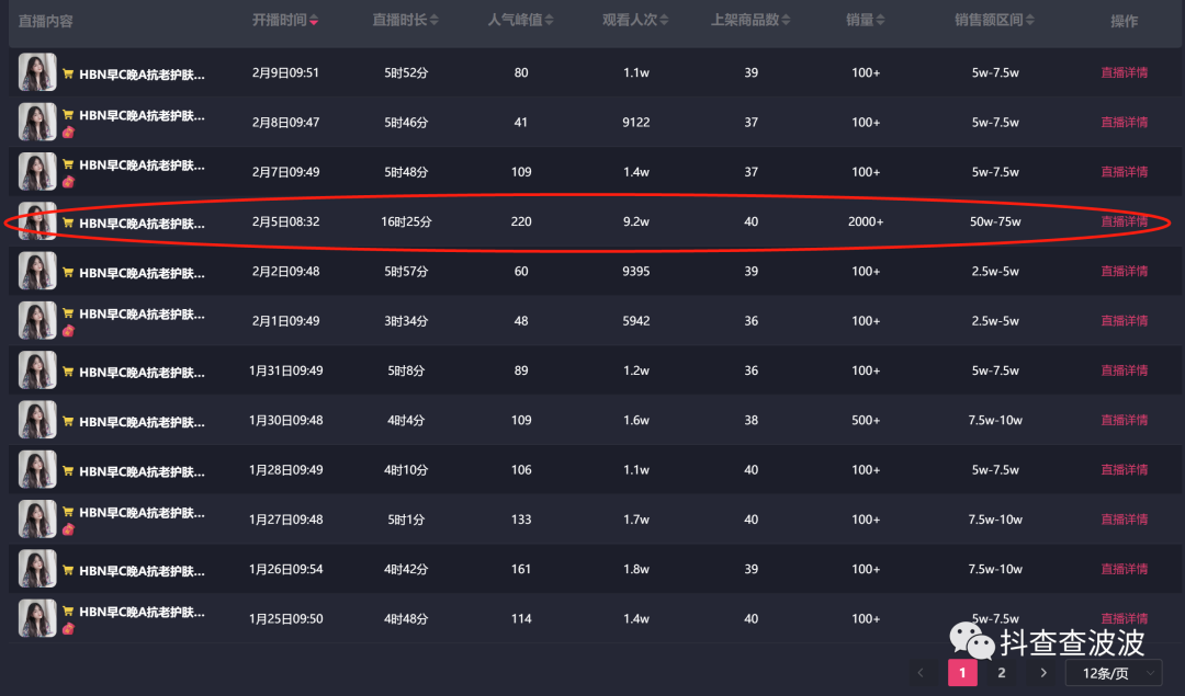 在抖查查里面搜索HBN的相关直播,就可以看到很多这类的达人直播间,点击去后发现是日播型账号,每天都是HBN这个品牌的专场。一般情况每天播5个多小时,偶尔流量好还有拉时长高GMV的大专场。