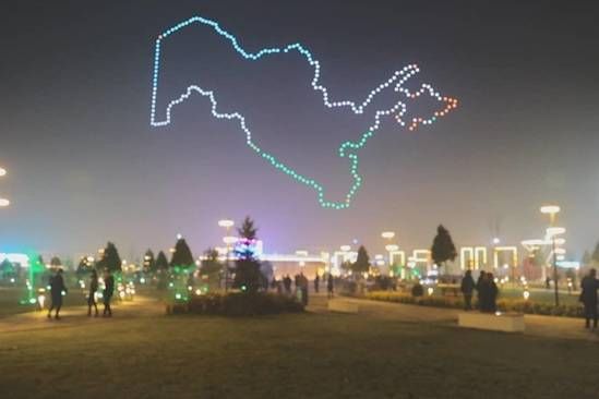 据“报纸”网消息,12月31日晚,Tashkent City上空上演了首场无人机灯光秀。250架无人机升空至125-150米,在夜空中列队依次组成了乌兹别克斯坦地图、古城、国徽、倒计时、新年快乐等图案。