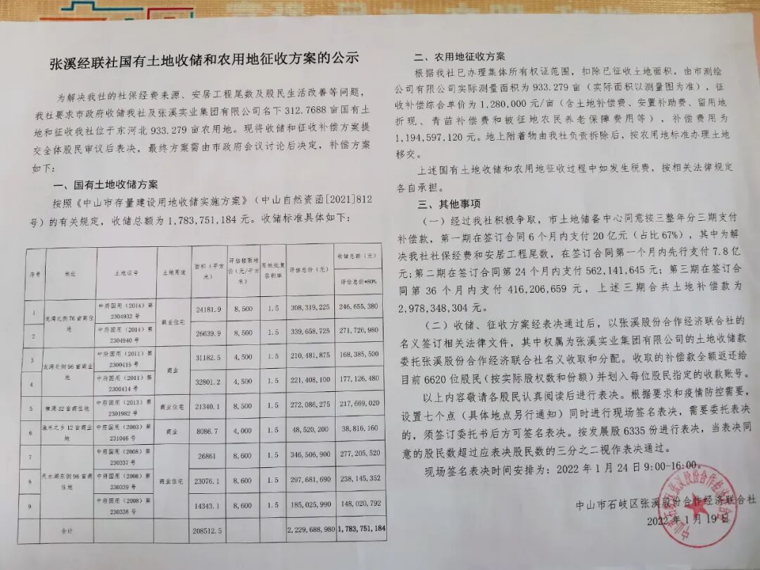 房叔了解到《张溪经联社国有土地收储和农用地征收方案》正在公示,即将展开投票,拟征收约20.85万平,补偿总金额约为29.78亿元。
