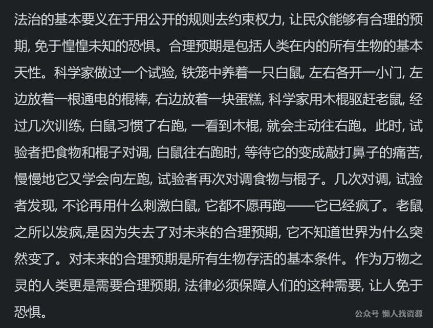“法治的基本要义在于用公开的规则去约束权力, 让民众能够有合理的预期, 免于惶惶未知的恐惧。”,联系上一章来理解。
