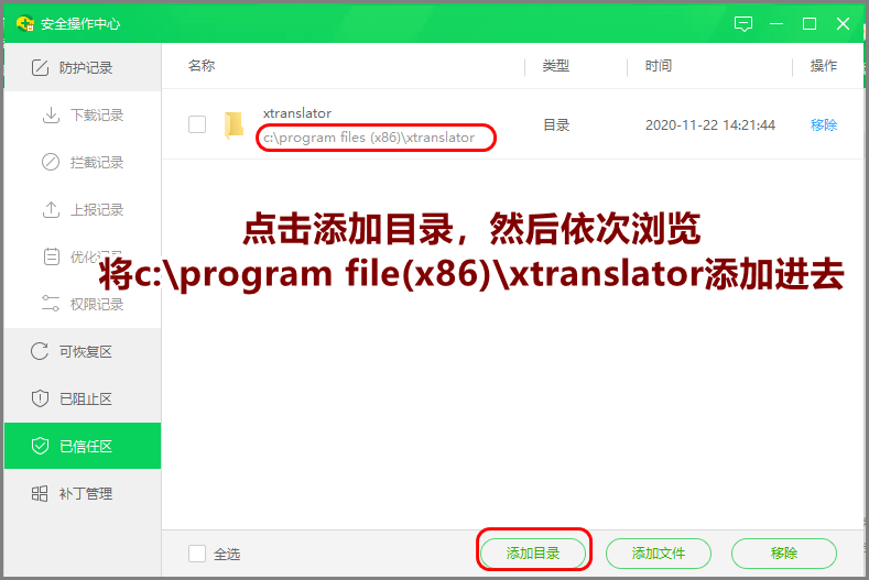 然后点击左侧的“已信任区”,点击下方的“添加目录”,然后依次浏览找到xtranslator的安装文件夹。如果你没有修改过安装位置,默认是在C:\Program Files (x86)\下的xtranslator文件夹。