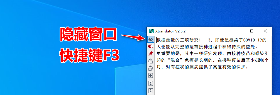 如果不想翻译,只需要隐藏窗口即可。F3键可以切换翻译窗口是隐藏还是显示。当然最小化窗口也行,最小化后软件不会监控剪切板也不会翻译。下次显示窗口后才会翻译。