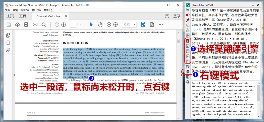 2、把Xtanslator 翻译模式切换到划选模式,如下图。然后鼠标在左侧文档或网页中划选一段话。软件下方原文处自动获取到选中文字,并在译文区显示译文。