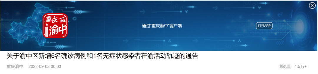 9月3日,重庆市渝中区新型冠状病毒肺炎疫情防控工作指挥部发布关于渝中区新增6名确诊病例和1名无症状感染者在渝活动轨迹的通告。