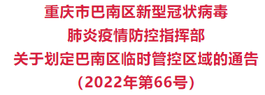 根据当前巴南区疫情防控工作需要,按照相关规定,经区疫情防控指挥部研究决定,自2022年10月6日00:00时起,在辖区内划定临时管控区。现将有关事项通告如下: