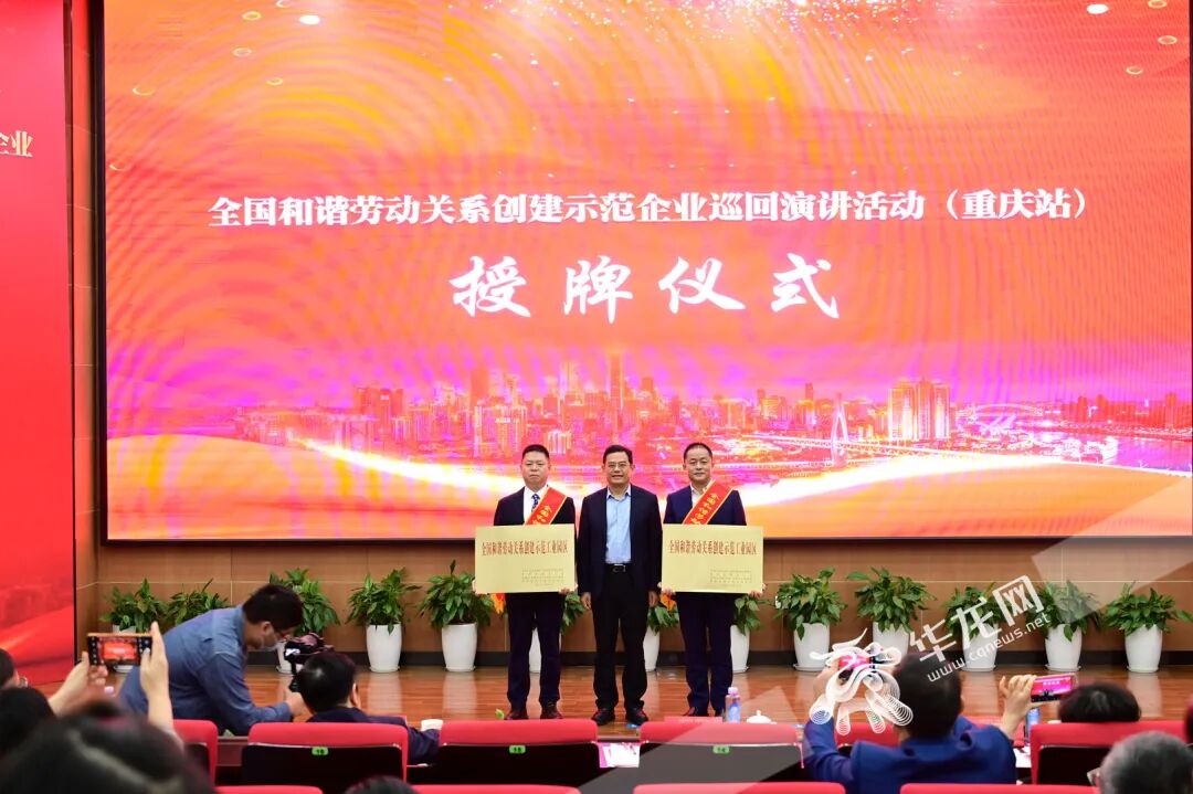 活动期间,市协调劳动关系三方成员单位领导为重庆市荣获2022年全国和谐劳动关系创建示范单位称号的企业和工业园区颁授奖牌。其中,重庆长安跨越车辆有限公司、重庆建峰工业集团有限公司、重庆三峰环境集团股份有限公司、西南药业股份有限公司、重庆航天火箭电子技术有限公司、重庆长江电工工业集团有限公司、中国石油天然气股份有限公司西南油气田分公司重庆气矿、重庆机场集团有限公司、冀东水泥重庆合川有限责任公司、长城汽车股份有限公司重庆分公司、重庆聚融建设(集团)股份有限公司、中煤科工重庆设计研究院(集团)有限公司、中国农业银行股份有限公司重庆市分行、重庆理文造纸有限公司14家企业获评“全国和谐劳动关系创建示范企业”称号;重庆两江新区、重庆经济技术开发区2个工业园区获评“全国和谐劳动关系创建示范工业园区”称号。