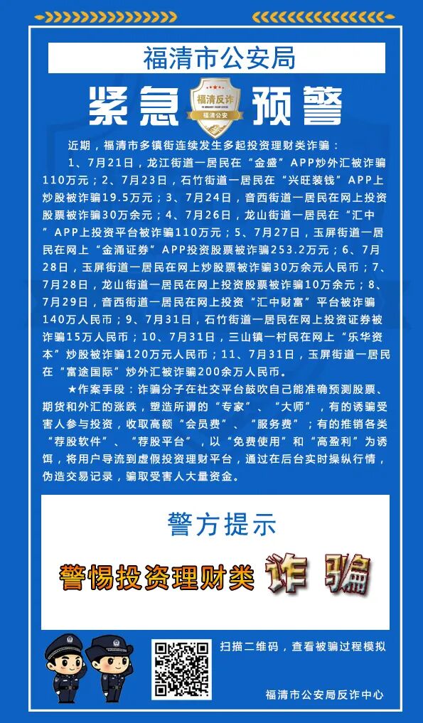 近期,福清市多镇街连续发生多起投资理财类诈骗: