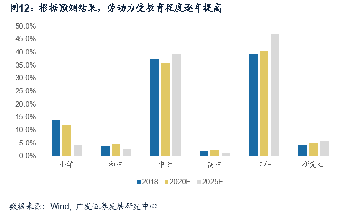 预测结果显示,各个教育阶段的毕业生向市场提供的劳动力规模在2015年见顶(1900万左右),随后快速下降。进入就业市场的毕业生规模底部大致出现在2021年(1500万左右),2022-25年将缓速回升,预计2025年这一数据将为1600万。结构上看,高等教育(本科生、硕士研究生、博士研究生)毕业生比重逐年上升,其中本科毕业生占比可能由2018年的39.2%提升到2025年的46.9%;初等教育(小学)、初级中等教育(初中)、中等职业教育(中专)、高级中等教育(高中)占比持续下降,预计高中以下(含)毕业生占比将很快回落到50%以内。从这一预测结果来看,未来各个教育阶段输送毕业生对劳动力市场形成的供给压力并不大,但高等教育毕业生数量将持续增加,可能存在结构性就业压力。