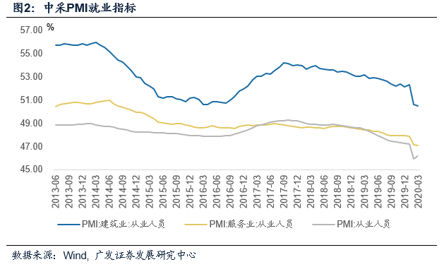 常用的就业指标反映出哪些信息?2020年2月,城镇调查失业率由去年底的5.2%攀升到6.2%;即使在就业压力相对小的两个领域:31个大城市与25-29岁中青年,失业率也出现了不同程度的上升。就业人数方面,城镇新增就业人数同比下降37.9%,去年表现已经比较差的失业人员再就业与就业困难人员再就业人数,今年2月的降幅分别为36.8%与34.8%。中采PMI指标显示,建筑业、制造业、服务业的就业情况在今年1-2月都出现了不同程度的恶化,其中建筑业下降最快,制造业次之,但降幅都比较显著。