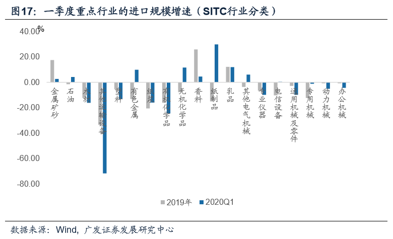 供给端修复路径之三:未来海外供应链的修复。进口方面,我国进口依存度比较高的行业主要集中在资源品、加工材料、电子元器件与电子通信设备、机械设备等领域,一季度飞机、日化品、金属矿、有机化学品、塑料、通用机械及零件、动力机械、木材、办公机械、专业仪器等品类下滑最快。4月中旬以来,全球疫情中心逐渐向拉美、俄罗斯、印度、非洲等地转移,目前德国、美国已在推动复工或准备推动复工,未来全球供应链的改善值得关注。