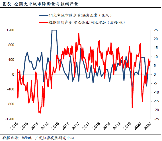 从一个简单的协整模型来看雨季对于建筑业以及房地产投资建安部分的季节性扰动。为捕捉全国降水情况的超季节性特征,在此选取广州、重庆、镇江等11个城市降水量作为分析样本,(1)不难发现4月起全国降雨量逐步上升,6-8月达到全年季节性峰值;(2)其次计算样本(月度)降水量偏离正常值的范围以剔除季节性,近五年数据显示:2016Q2、2017Q3、2019Q2均出现降雨量显著偏高的结论,与相应年份洪涝灾害肆虐时点较为吻合。(3)更进一步的,依照上述部分结论,雨季影响下钢铁与建材行业需求或将受到直接冲击,在此选取高炉开工率、重点企业钢材日均产量、全国建材家居卖场销售分别表征钢铁、建材需求。数据显示:2015年至今的全国降雨量偏离指数与建筑业需求呈现显著负相关性,即降雨量显著超过往年均值的阶段(如2016Q2、2019Q2),同期高炉开工率、重点企业钢材产销以及水泥景气度同比下行幅度扩大,对应微观层面国内建筑业真实需求走弱。