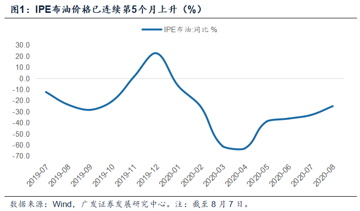 第一,原油价格。IPE布油价格已连续第5个月上升,8月第一周环比4月底已反弹67.7%。