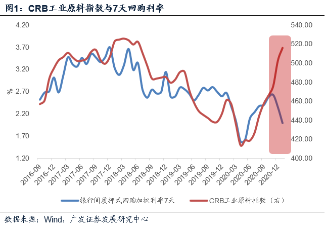 2020年11月以来两个指标明显背离,CRB指标往上,回购利率往下。即相对于名义增长预期来说,短期流动性偏宽。这个过程理论上来说不具有持续性。从上述两个指标来看: