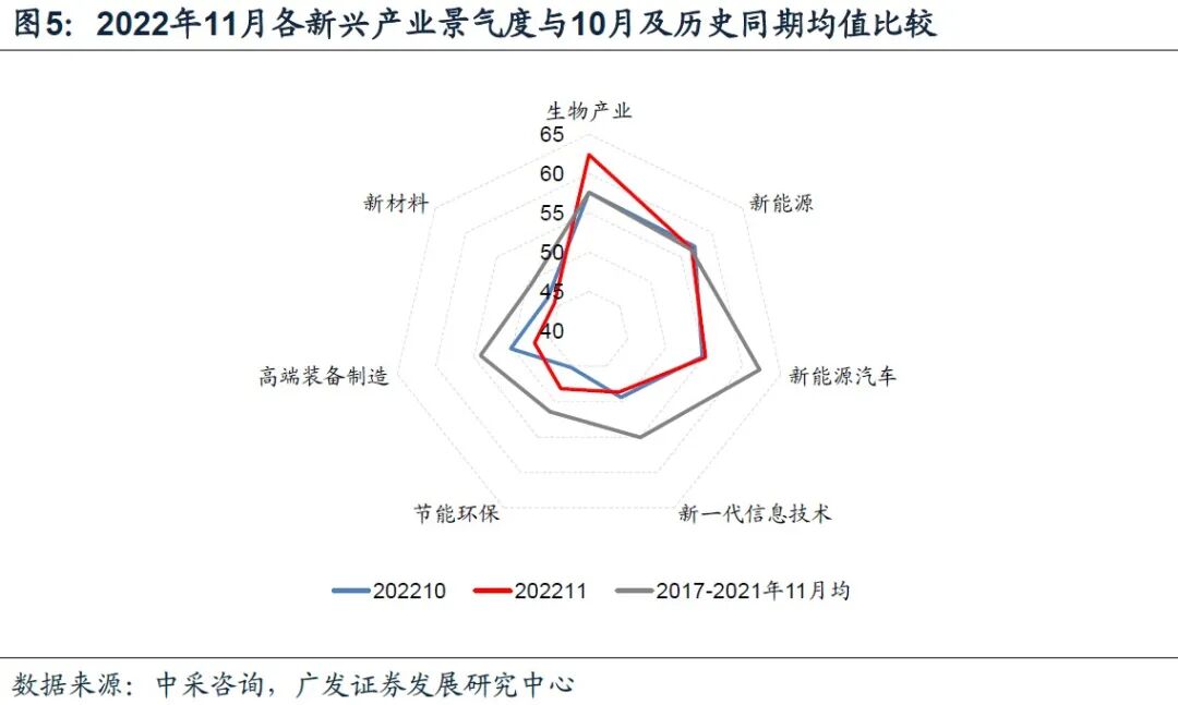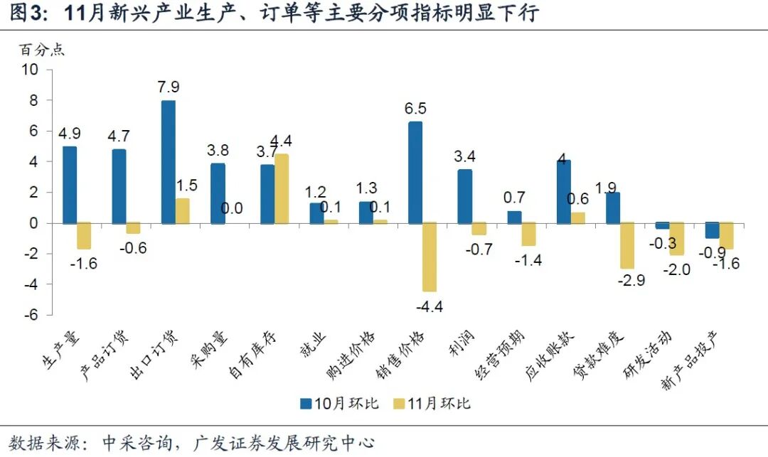 11月新兴产业继续保持了生产>订单>出口订单的分化特征,分别为52.2、51.7、48.1;10月三大分项指标分别为53.8、52.3、46.6。