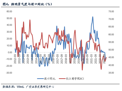 12月进口同比为-7.5%,略高于11月的-10.6%,但这一变化主要由基数分布导致。映射地产系投资需求的钢材、映射制造业投资需求的铜,目前进口数量同比均为显著负增长。整体而言,进口需求在较低的位置,尚未出现典型的修复趋势。随着各城市疫情逐步达峰,春节后消费和投资需求有望环比出现超季节性脉冲,CRB同比周期同时段应也处于底部位置,届时进口需求应该会有一个释放。