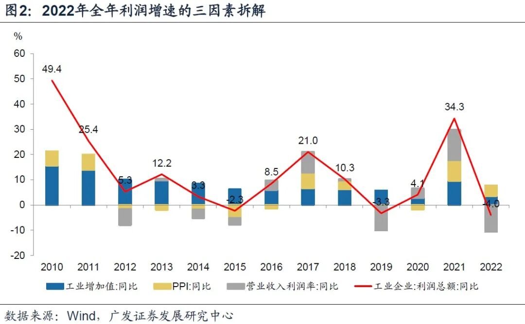 2022年全年来看,工业增加值、PPI同比分别增长了3.6%和4.1%,分别较2021年回落了6.0和4.0个点;营收利润率6.09%,显著低于2021年的6.81%。
