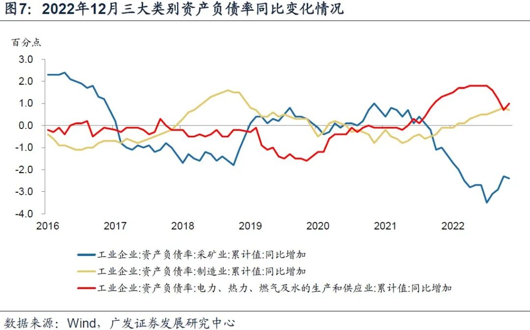 至2022年底,工业企业资产负债率56.6%,环比小幅下降0.3个点;同比上行0.3个点。从三大类别来看,采掘业去杠杆、制造业杠杆率同比小幅上行、公用事业加杠杆的分化特征未发生明显改变,仅就12月单月来看,公用事业杠杆率同比提高1个点,自11月的0.7个点有所加速,或意味着以新能源为代表的基建投资在短期内仍将保持在较高水平。