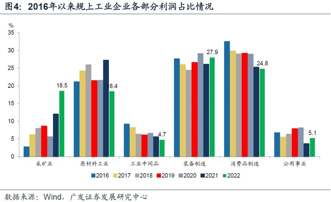 2022年上游掘利润占比创新高,中游装备和公用事业利润占比较2021年略升,原材料、中间品、消费品受挤压。(1)2022年上游采掘占工业部门整体利润总额的18.5%,为2016年以来新高;(2)2022年中游装备制造和公用事业利润占比较2021年分别提高1.9和1.6个点,但相较于过去几年利润占比的平均水平相比并未明显偏高;(3)原材料、中间品、消费品利润占比分别较2021年下降了8.8、0.8和0.4个点,均创下2016年以来新低,与疫情下的消费受限、地产产业链全面下降有关。