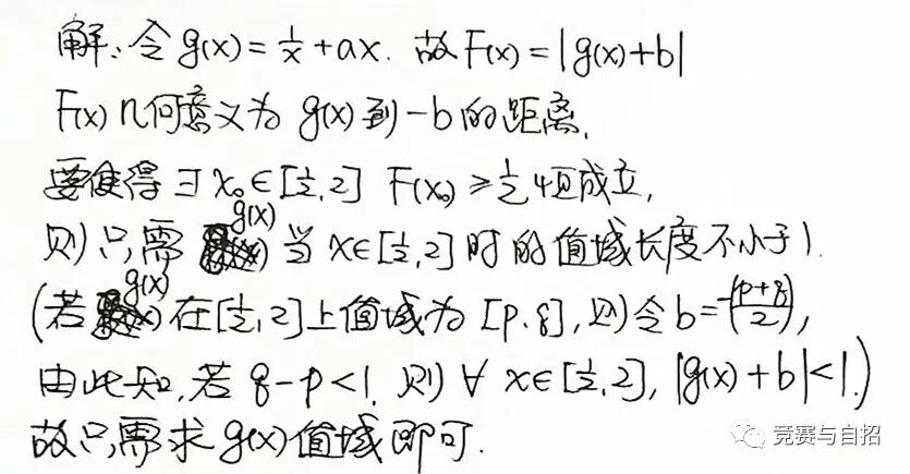 该题涉及到了3个变量,x,a,b,其中实数b是任意的,x是存在的,求的是a的范围。从函数的角度来看,应该是F(x)的最大值的最小值不小于0.5,也就是说,这是个双重最值问题。对于这类问题,已经有很多的研究,我们对此不予讨论。今天我们从另外一个角度来看看此题的解法,也许你会有意想不到的收获哦!