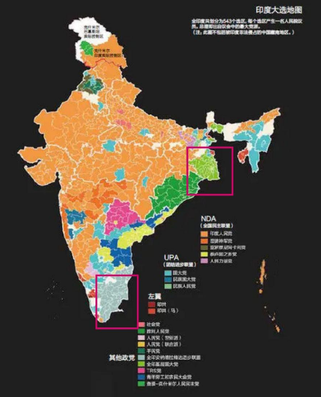 可是这样的超级大邦,以及东南周边相邻的几邦,居然几十年都不在中央党派的控制之下,简直就是印度版的「地方割据势力」。这些地方割据势力,民族组成复杂,语言各不相同,部分邦的穆斯林人口超过三分之一,简直就是「语言多元,政党多元,民族多元」,是人民党纲领的对立面。所以在2019年莫迪和人民党在全国选举大胜之后,东南这几邦已经是莫迪和约吉大一统梦想的最后绊脚石。根据印度宪法,东南几邦的地方选举,由印度国家选举委员会组织,各自在不同时间选举结束。![]()