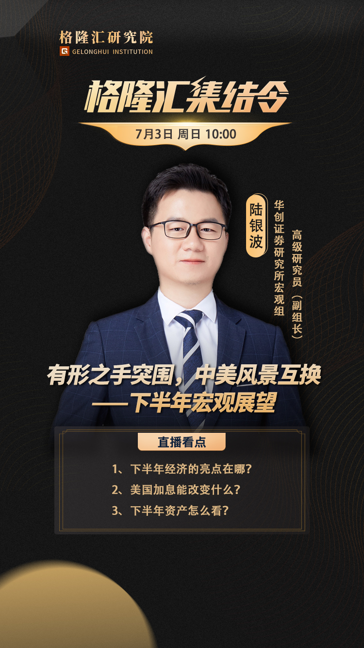关于以上问题7月3日(周日)上午10:00,格隆汇研究院将联合华创证券研究所宏观组高级研究员(副组长) 陆银波先生与您一起探讨有形之手突围,中美风景互换——下半年宏观展望!