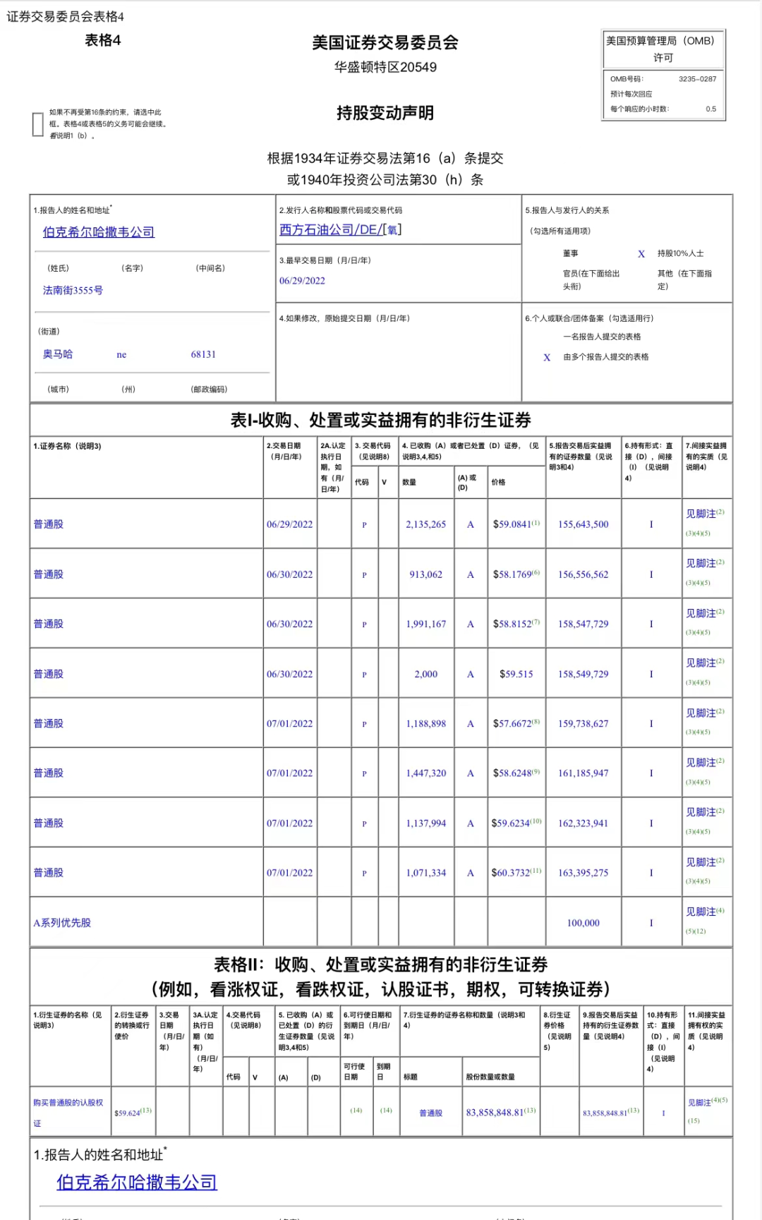 根据SEC披露的文件显示,伯克希尔在6月29日至7月1日耗资5.82亿美元加仓西方石油990万股。